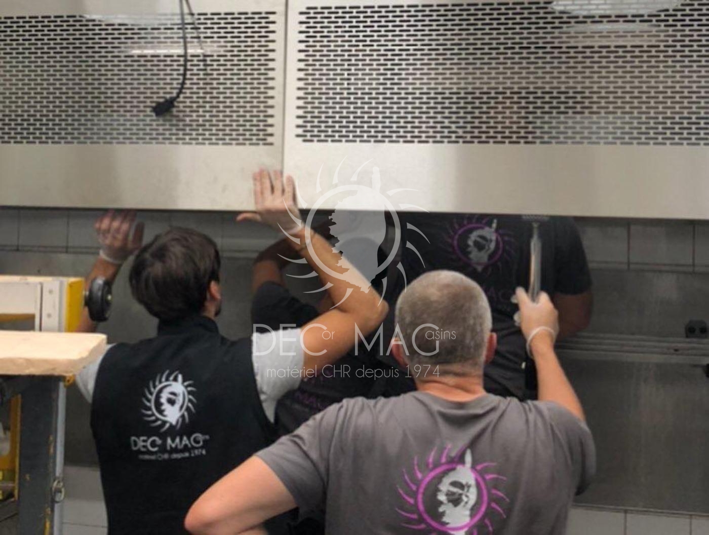 Livraison et installation au Cafe Del Mare Bastia d’une hotte double flux avec caisson de filtration de 3 mètres et caisson d’insufflation.