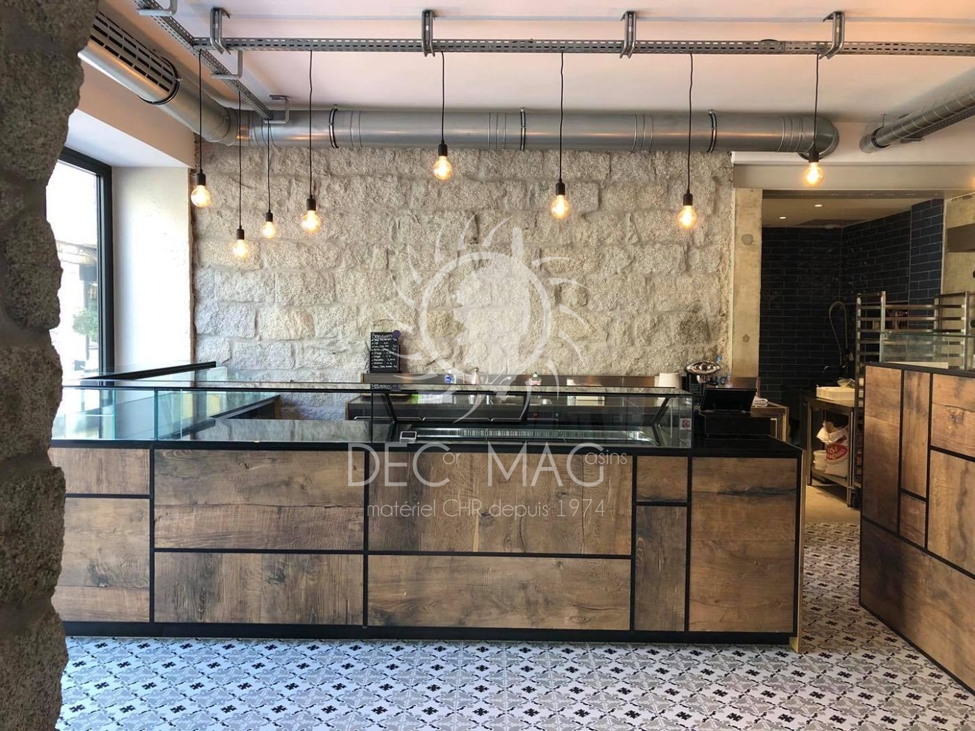 - Vitrines sur mesure avec partir bar et habillage coloris Madison. Fabrication d’un habillage sur mesure pour le meuble à pizza.