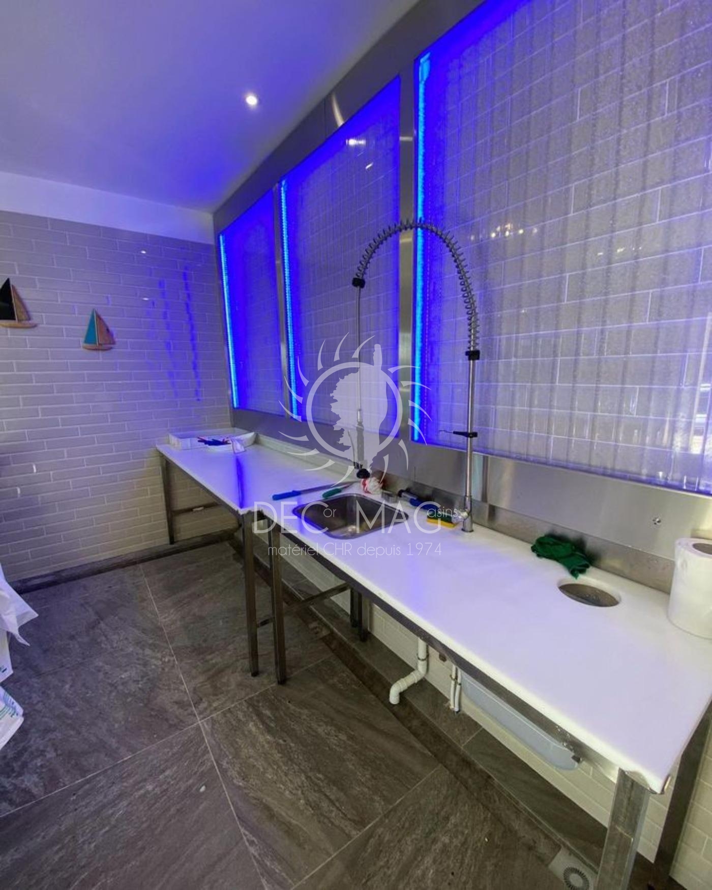 - Table de préparation Tournus avec douchette, bac à déchet et bac de lavage intégrés.