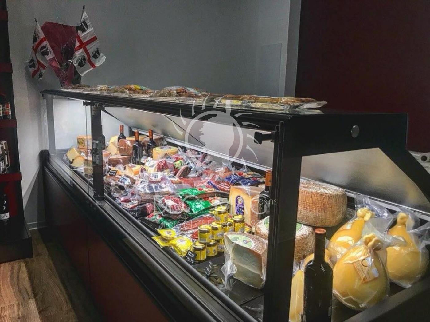 Mise en place d'une vitrine réfrigérée fond noir avec façade bordeau assortie aux rayonnages.