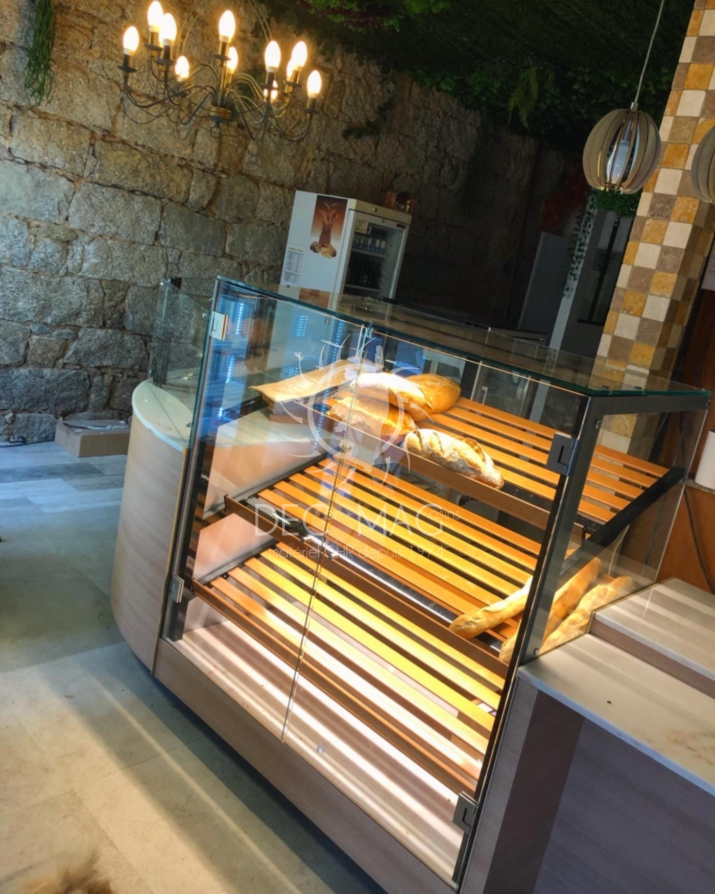Vitrine froide + vitrine chaude + caisse + meuble à pains avec portes vitrés, retour d’angle.